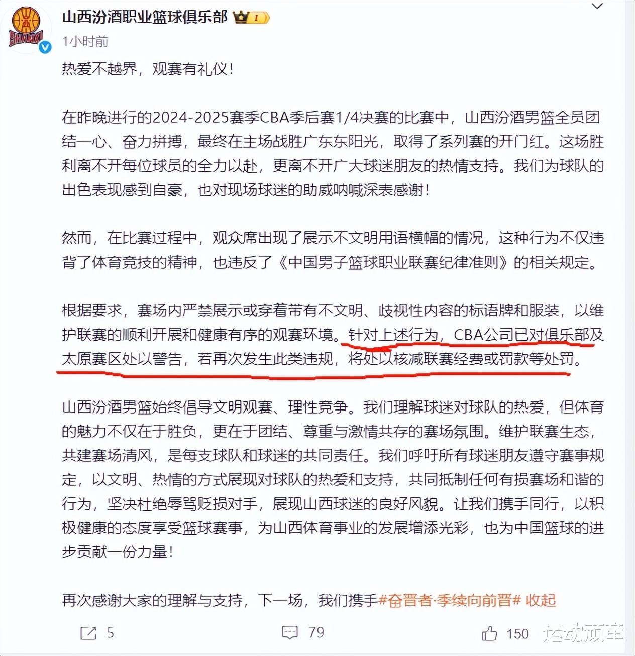 今天下午五点,CBA给山西队发出通告,对山西太原赛区的不文明做法处以警告,若再次发生此类违规,将进行严厉处罚。