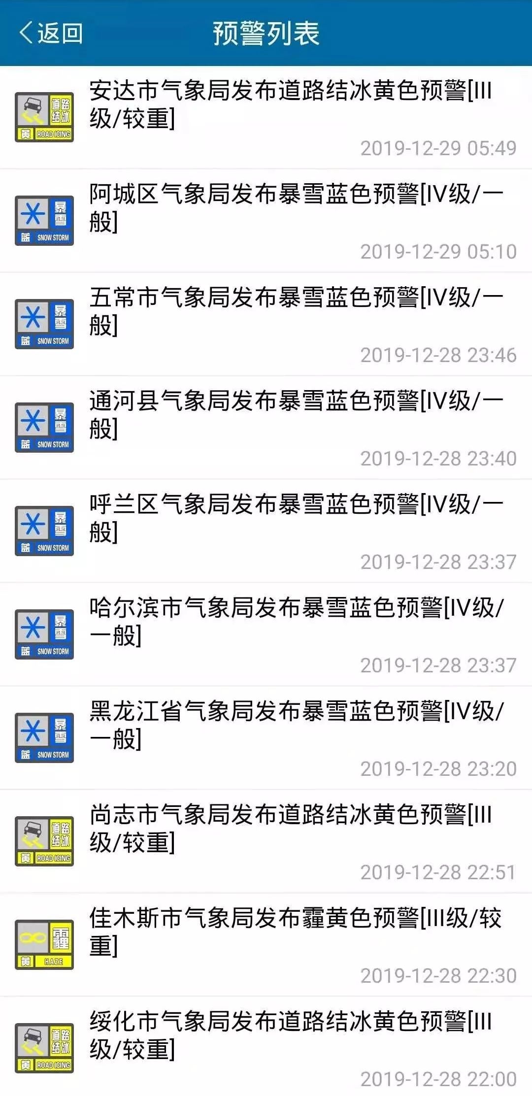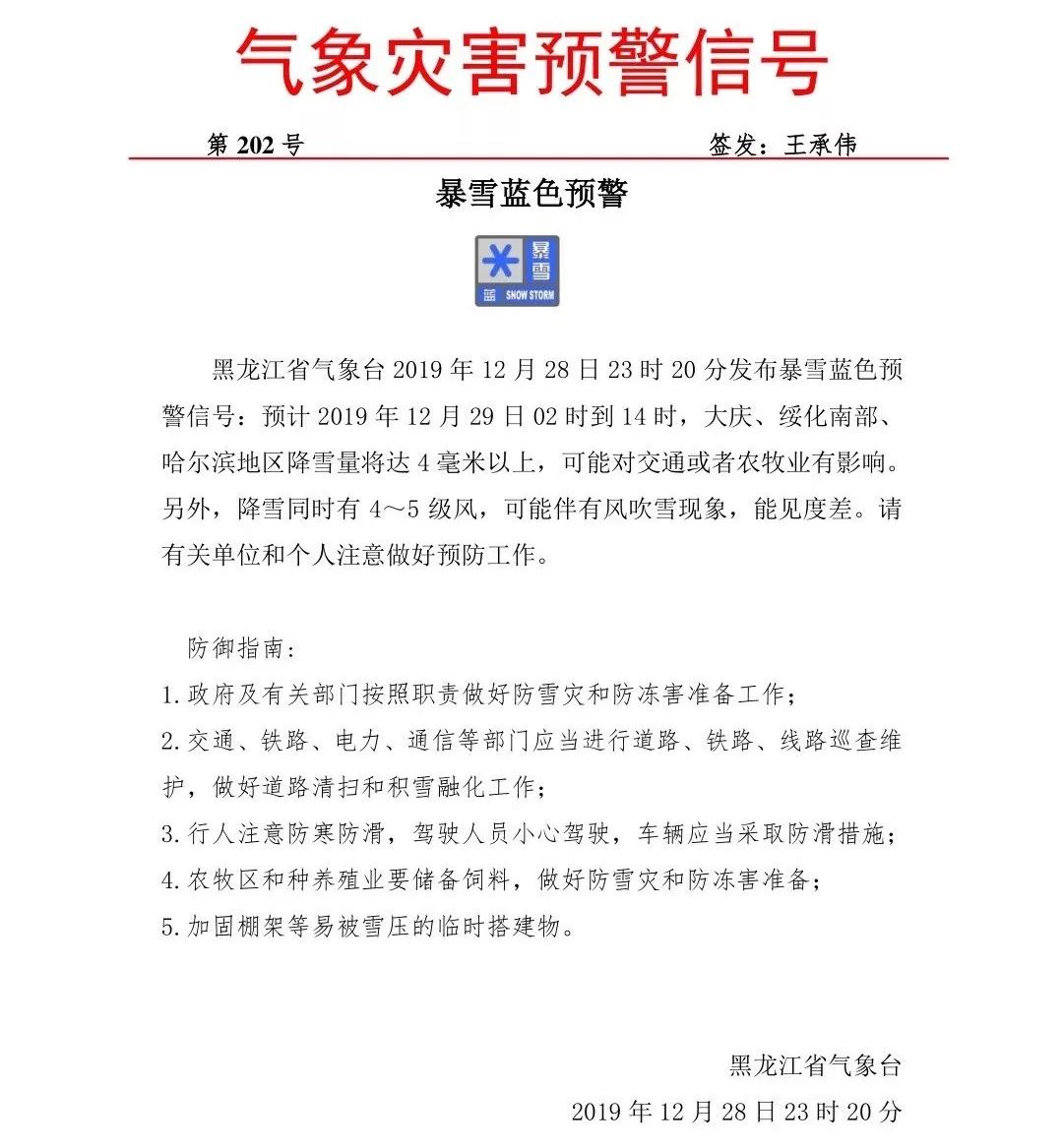 黑龙江省气象台2019年12月28日23时20分发布 暴雪蓝色 预警信号: 预计2019年12月29日02时到14时,大庆、绥化南部、哈尔滨地区 降雪量将达4毫米以上 ,可能对交通或者农牧业有影响。另外,降雪同时有4~5级风,可能伴有风吹雪现象,能见度差。请有关单位和个人注意做好预防工作。