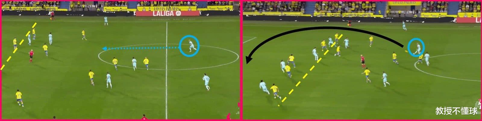 但由于拉斯帕尔马斯的后卫线与球之间的距离较短,他们成功压缩了可用空间,使得即便是技术精湛的巴萨球员,也难以完成流畅配合。