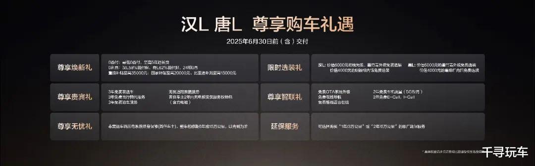 伴随汉L的上市,比亚迪王朝网还准备了七重购车礼遇。截至6月30日24:00前完成购车开票,用户可享尊享金融礼,0首付、0利息任选其一;尊享置换礼,置换补贴至高35000元;还有尊享无忧礼、尊享贵宾礼、尊享智联礼、延保服务可选。其中,尊享置换礼中除了至高20000元国补,更有首销期限时置换补贴10000元,同时比亚迪老车主额外可享5000元置换补贴加码!此外,用户额外可享限时选装礼,包括价值6000元的琉光银、墨竹青外观免费选装、价值4000元的绸锻棕内饰免费选装。尊享购车礼遇加持,进一步降低消费者的购车用车成本,让更多年轻用户畅享旗舰级出行体验。
