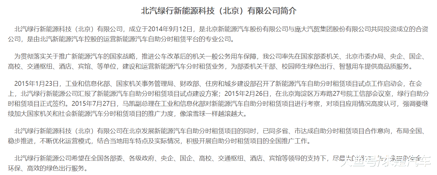 2014年10月,北京新能源汽车营销有限公司与庞大汽贸集团股份有限公司,以51:49的比例,合资成立了北汽绿行新能源科技(北京)有限公司(简称北汽绿行)。