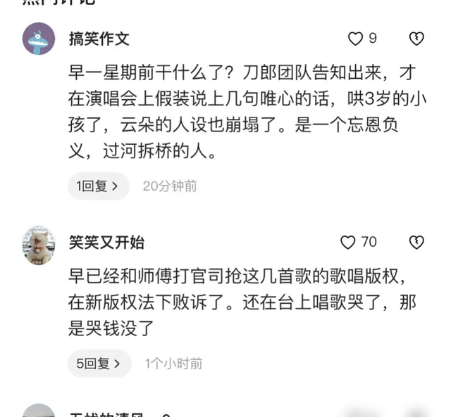 网友对云朵的举动褒贬不一。据了解,在2019年云朵凭借四首刀郎曲目走红,是刀郎的徒弟。