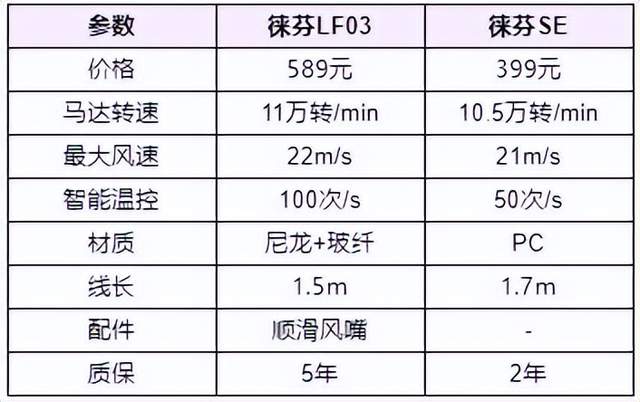 在恒温技术方面,LF03采用智能温控,监测频次高达100次/秒,对风温的把握更加精准。而徕芬的SE频率是50次,虽然跟徕芬的LF03区别有点大,但是也不低了,大部分吹风机都是50次,戴森HD15是40次。