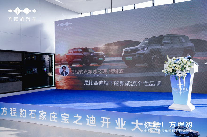 河北省首家方程豹汽车社会经销商店——璋晨集团旗下石家庄宝之迪方程豹4S旗舰店开业仪式上,方程豹汽车总经理熊甜波女士通过视频送上特殊的开业祝福;熊甜波女士提出:方程豹汽车是比亚迪旗下个性化品牌,致力于用技术实现个性平权,为美好生活添彩,以极致的技术,打造极致的产品,满足个性化用车需求。