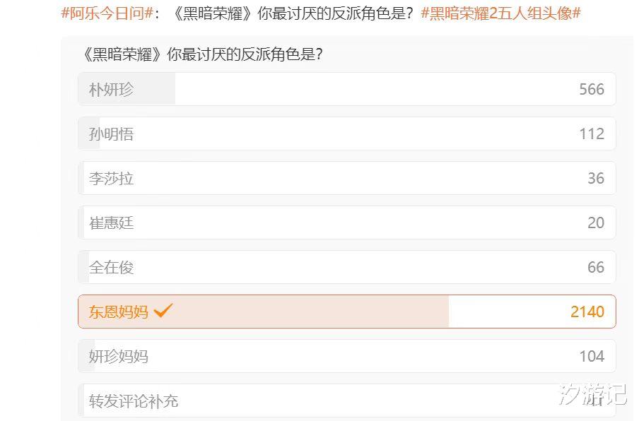 有大号组织投票,选#黑暗荣耀#中的最讨厌的反派,备选项除了5人组还有东恩妈妈和妍珍妈妈。其实有想到,东恩妈妈票数会高,但没想到的是,足足比妍珍高出了4倍,可当真是恶人团断层顶流了。