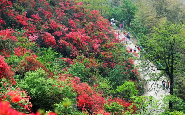 进入4月,野生杜鹃相继绽放,连绵的群山花开成海,映红山岭,勾勒出一幅天然的美丽画卷。