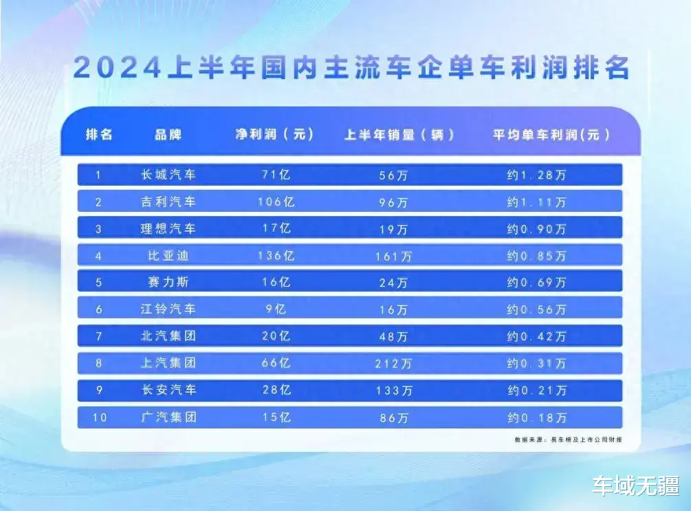 最近,2024年上半年主流车企单车利润排行榜出炉,在国内主流上市车企中,单车利润排名前十的依次为长城、吉利、理想、比亚迪、赛力斯、江铃汽车、北汽集团、上汽集团、长安汽车、广汽集团。