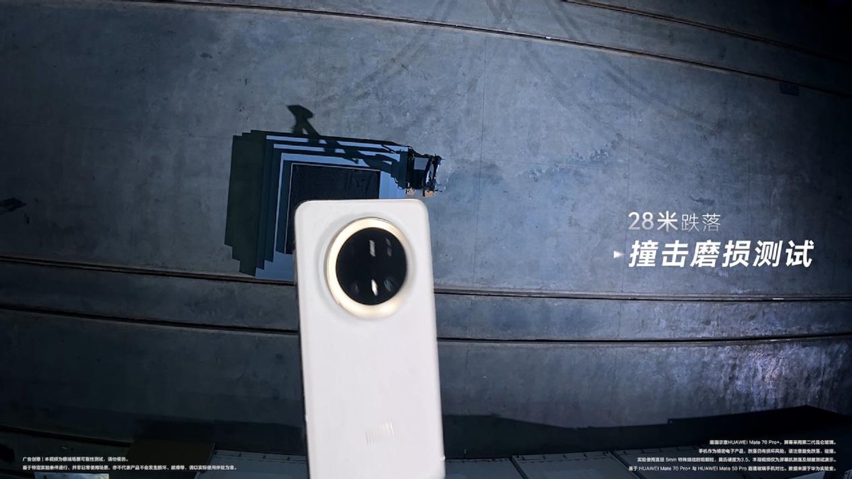 第二个场景进行了高达2米的跌落碰撞测试,一番测试下来,华为Mate 70 Pro+的高亮钛机身也是完好无损。甚至还有28米的木质地板撞击测试和28米的撞击磨损测试,同样都是完好无损的应对了。