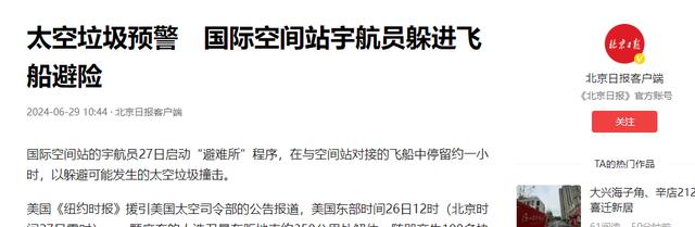 北京日报客户端:《太空垃圾预警国际空间站宇航员躲进飞船避险》
