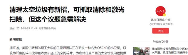 北京日报客户端:《清理太空垃圾有新招,可抓取清除和激光扫除,但这个议题急需解决》