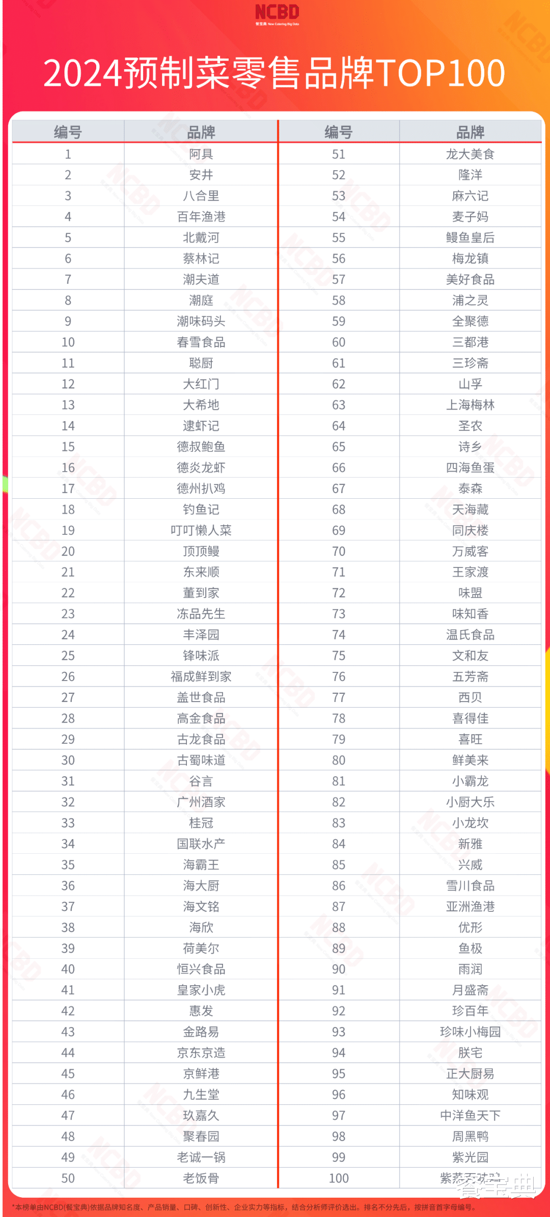 近日,餐饮大数据研究与认证机构NCBD(餐宝典)发布了“2024预制菜零售品牌TOP100”榜单。该榜单的评选面向在C端市场表现优秀的预制菜品牌,依据品牌知名度、产品销量、口碑、创新性、企业实力等指标,结合分析师评价选出。
