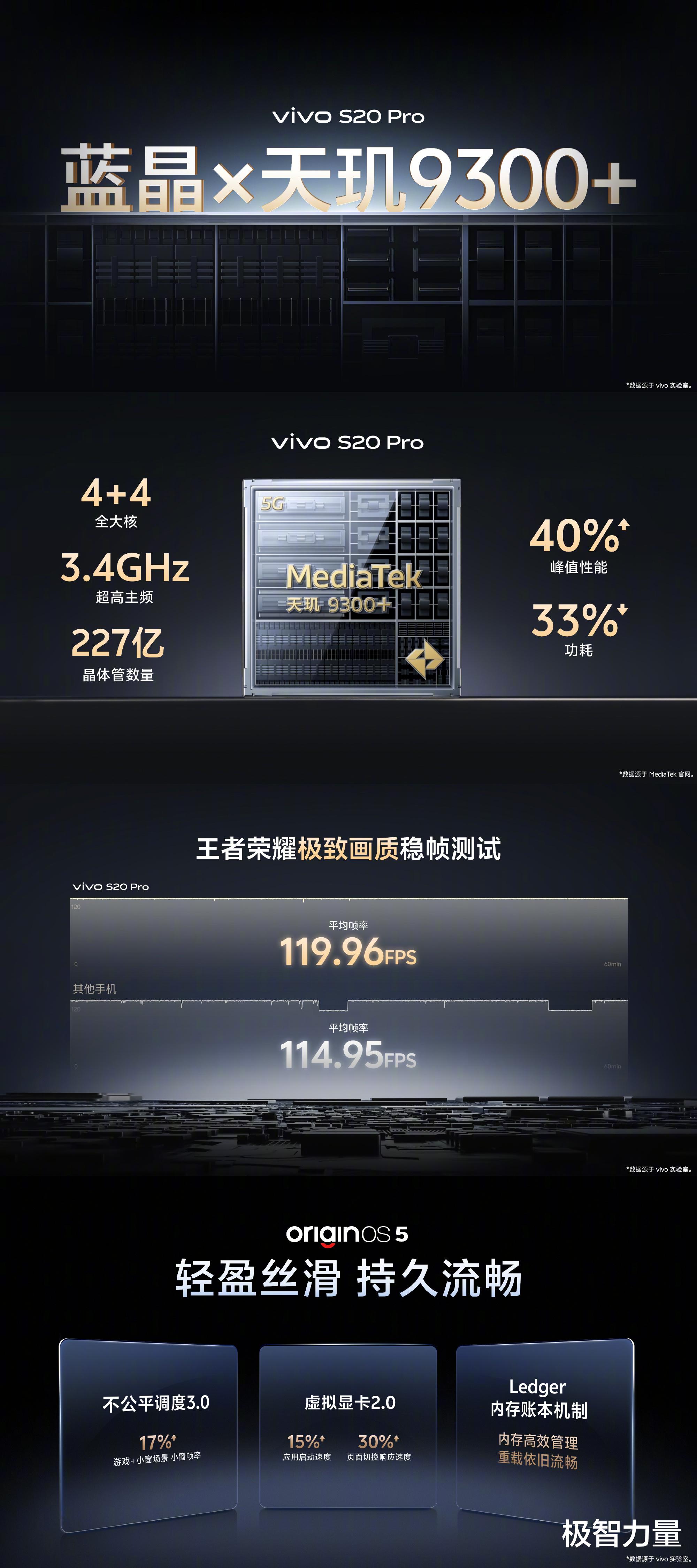vivo S20 Pro的性能也相当出色,搭载天玑9300+旗舰芯片,安兔兔跑分超225万的稳定输出,搭配OriginOS 5在游戏、硬件调度、内存管理等方面的一系列深度优化,轻松实现王者荣耀长时间120帧,后台驻留二三十个应用也不会卡顿,更是做到了60个月久用流畅。