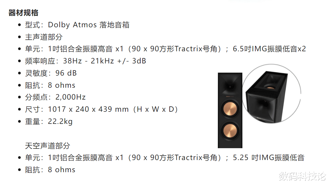 而且从技术实现上,采用天空反射增强技术来构建天空声道扫,最难搞定的就是高音,因为传统的带式高音单元指向性比较差容易音损,而球定高音单元指向性又太集中,导致位置不同听感差异比较大,所以很多类似的设计都不会舍弃单独的高音单元,而只是设计中低音单元。但杰士的优势是有独家的Tractrix高音号角技术,能在保证高音一定角度覆盖的同时也能保持较好指向性。这样一来,R-625FA在杜比全景声效果实现上就更为出色。
