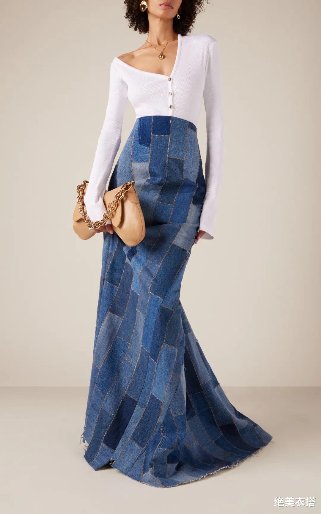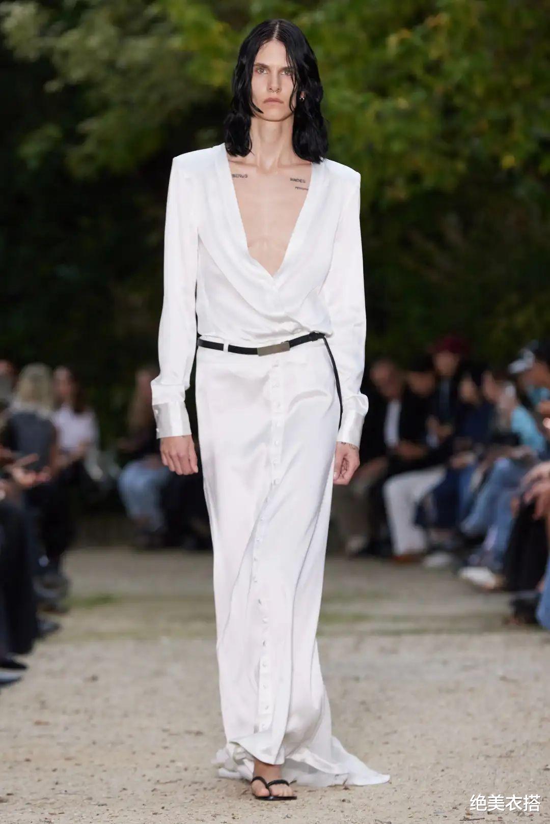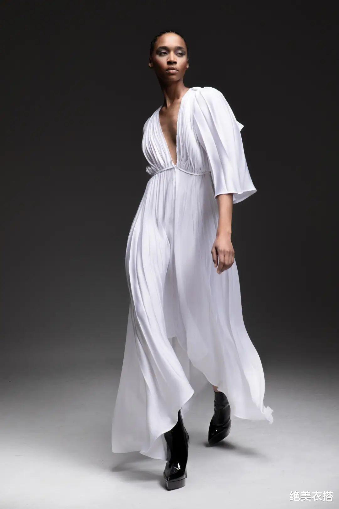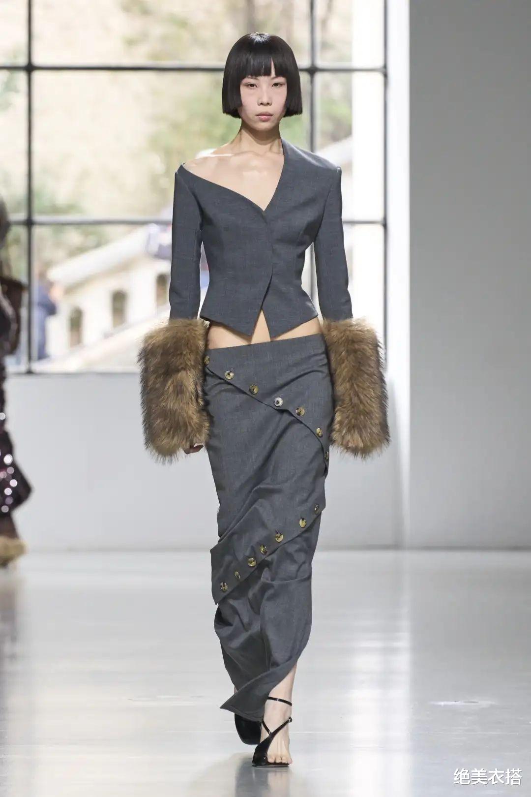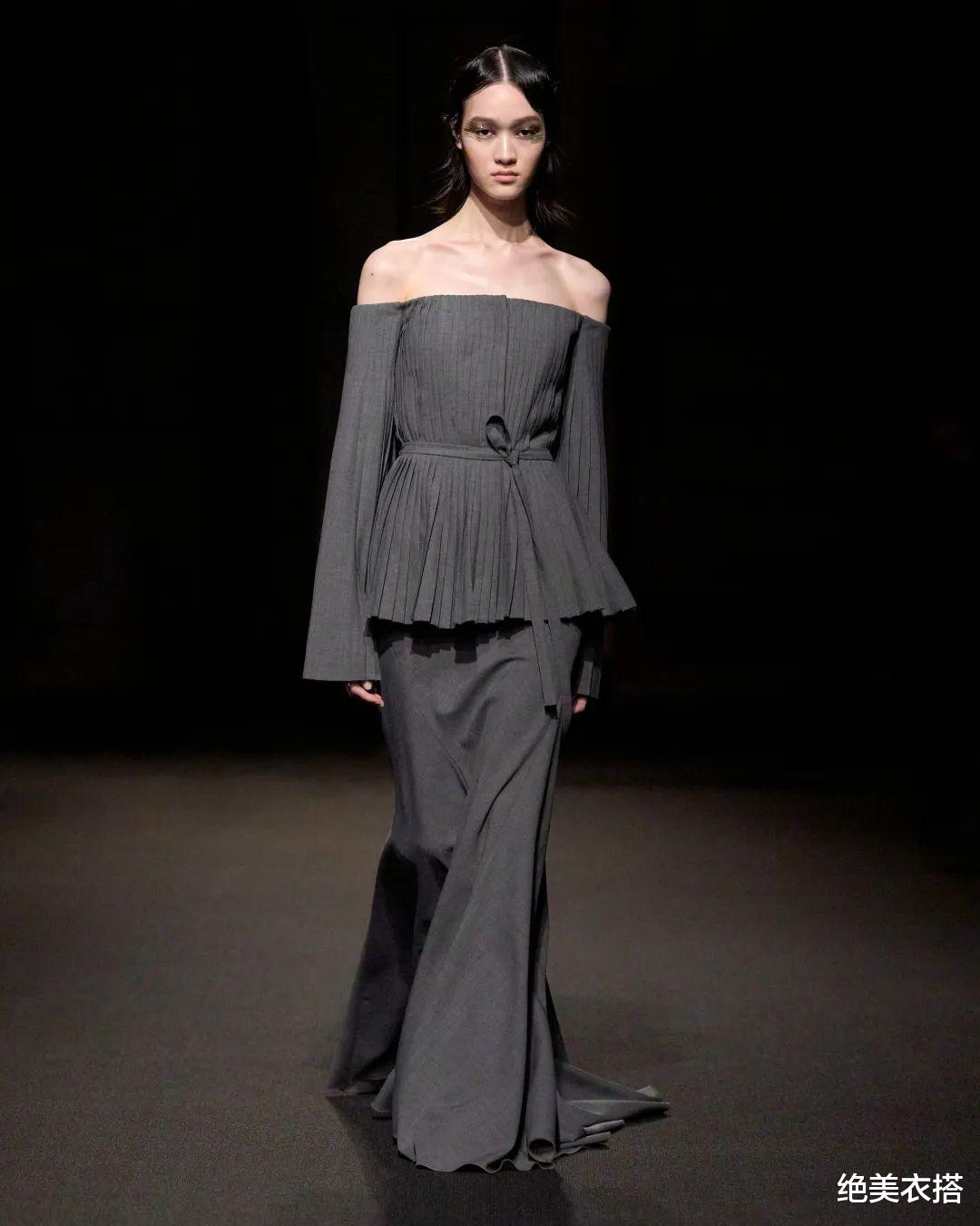 不对称领口、低腰半裙,独树一帜的设计,让静谧灰一举成名。张扬,又安然,对比意象格外分明。