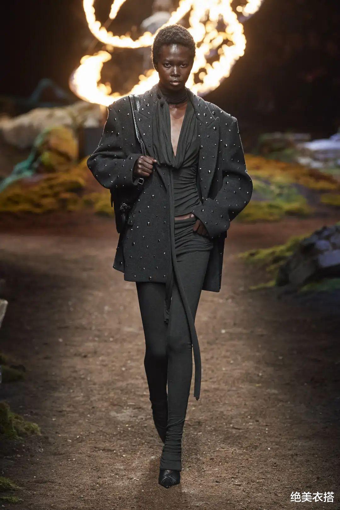 大廓形灰色西装,亮片大面积铺陈,从设计看,用尽了力,至少在与众不同方面,优胜。但此类手法,有人喜欢,有人不喜欢。