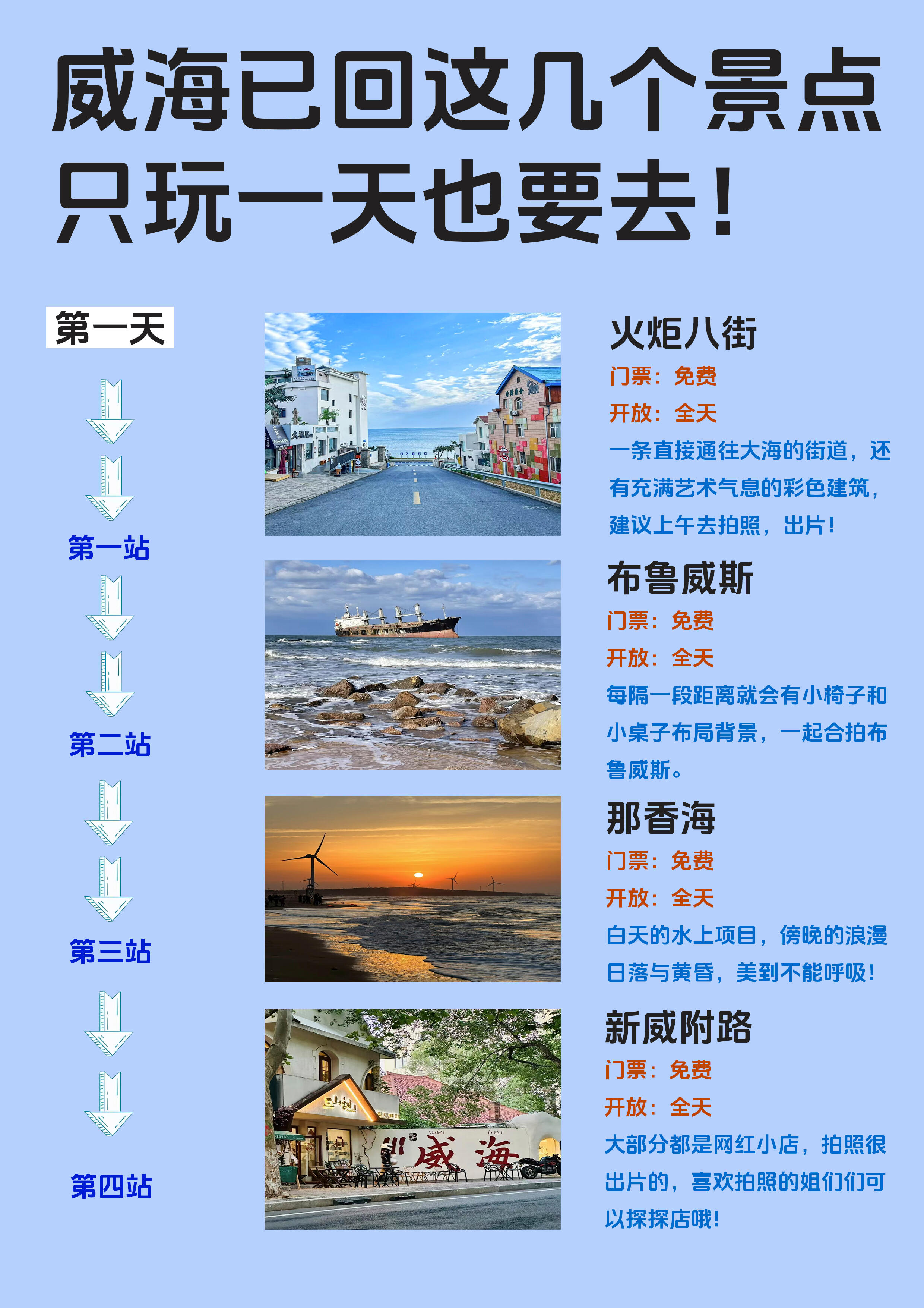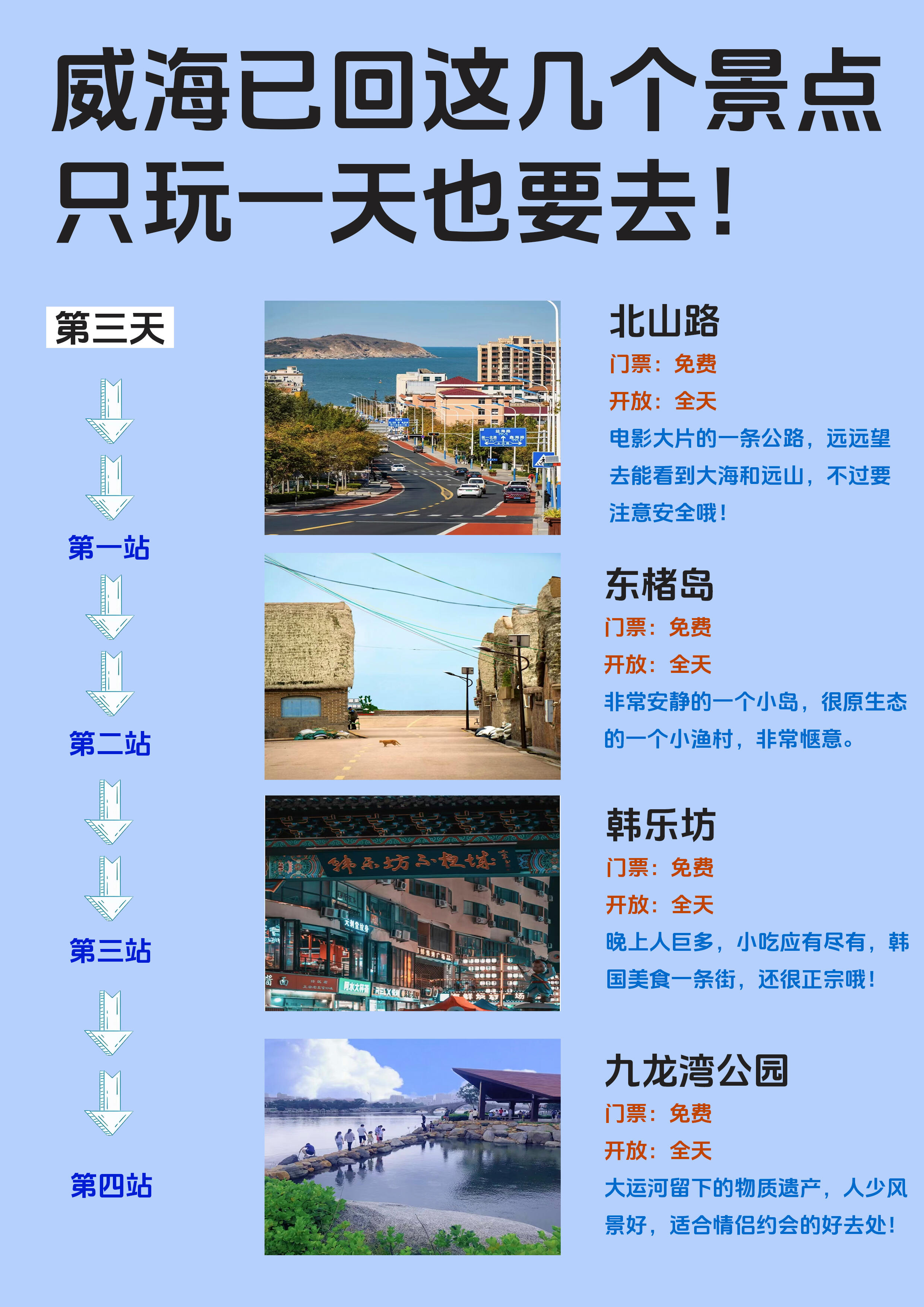 自驾游的宝子们出行方便但也要注意安全,旺季的时候会堵车哦(¬_¬")威海市区内打车还是很方便的,女孩子一定要结伴同行,不要玩太晚了!很多公交车都是直达景点的,绿色又便宜!