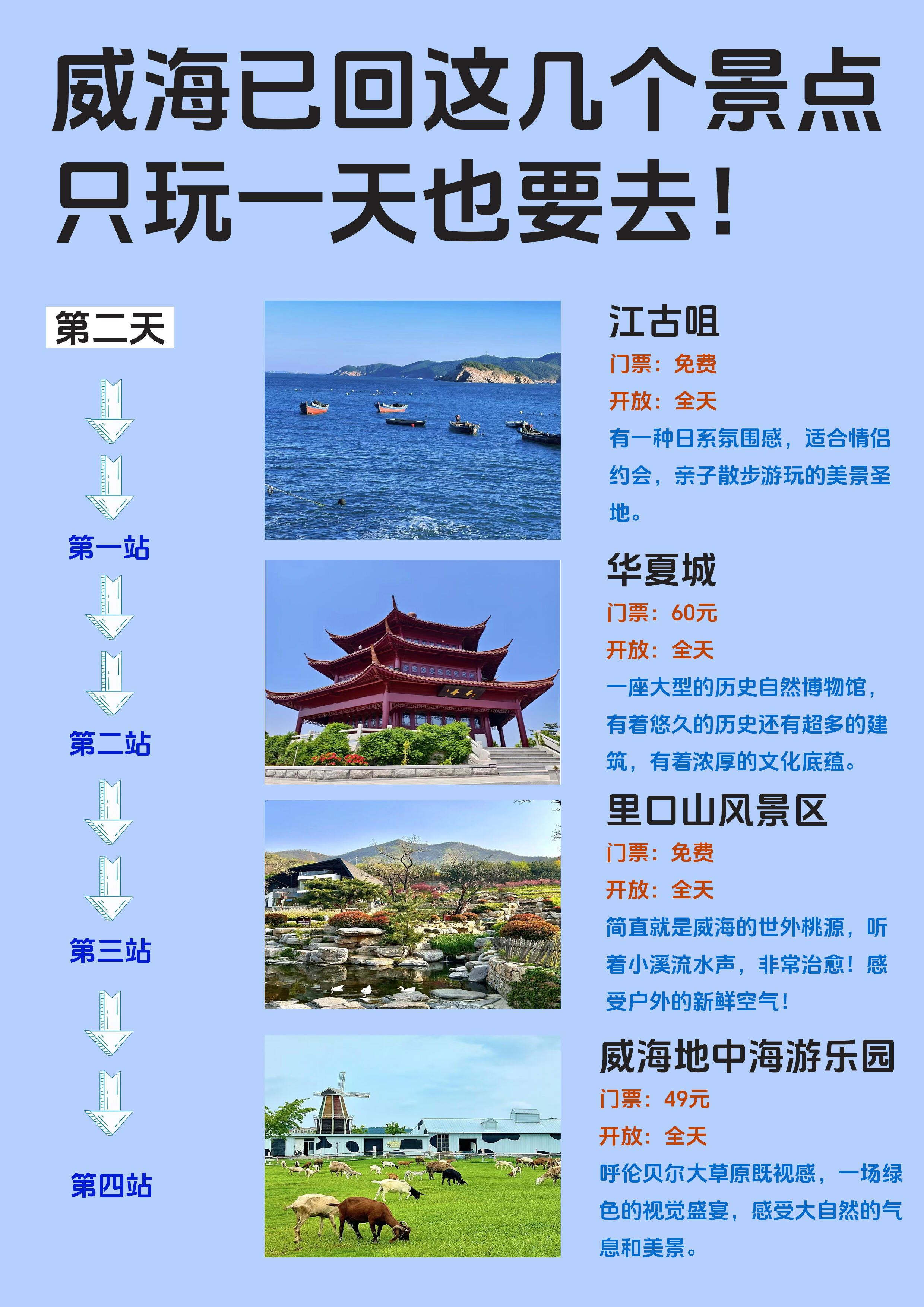 第一站→江古咀→第二站→华夏城→第三站→里口山风景区→第四站→威海地中海游乐园