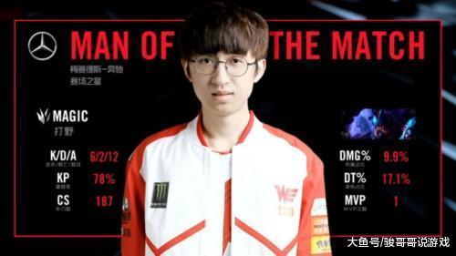 第二场比赛,JDG可能感觉第一把被伤了面子,与WE前期就开始硬刚,但是WE的新人打野Magic前期的灵性Gank为WE赢下比赛奠定了基础,并最终收获了生涯第一个MVP。