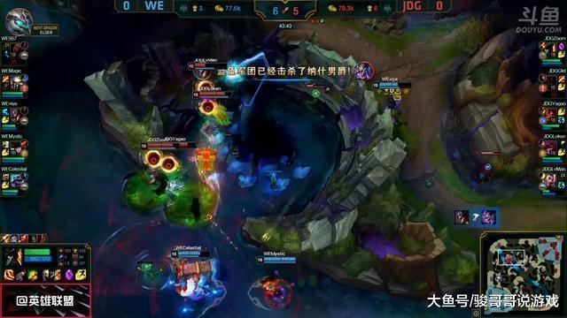 本来第一场比赛中,前期JDG的节奏一直都很好,稳步的扩大着优势,但是WE的双C发育得不错,导致JDG一直上不了高地,上不了高地的JDG想用抢夺地图资源的方式扩大己方优势,然而后来的一波远古龙团战,JDG中路岩雀一波大招封路坑了队友,再加上被xiye的崔斯特Q抢掉93滴血的大龙,JDG瞬间就爆炸了,被一波结束了比赛。