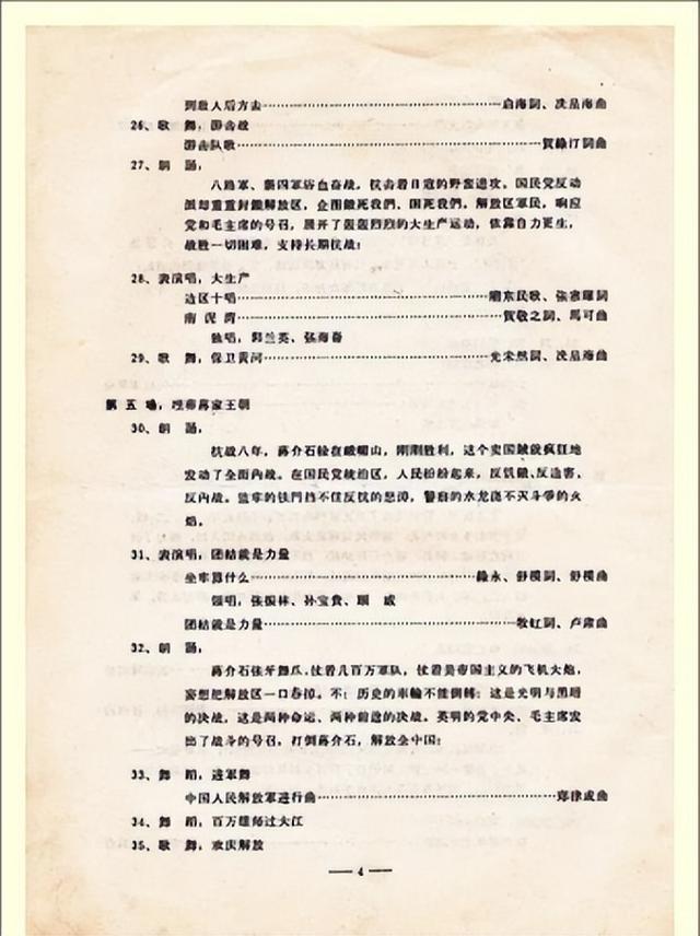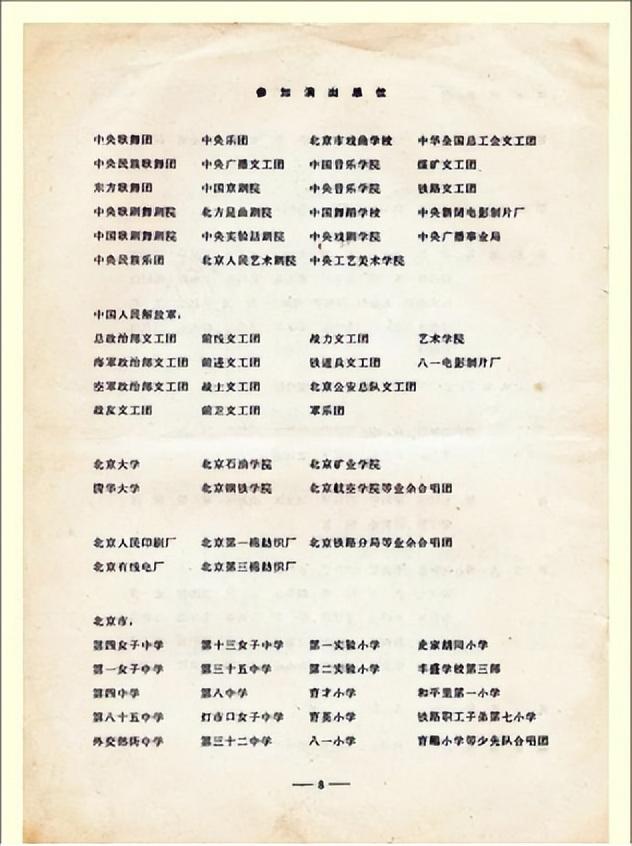 节目单共有8页,第1-6页为序曲和第一至第八场朗诵词,歌曲、舞蹈名称,词曲作者,演唱者;第7页为主要创作人员名单,包括导演团:陈亚丁、周巍峙、时乐濛等,朗诵词作者:魏巍、郭小川、贺敬之、徐怀中,指挥:黎国荃、严良堃、胡德风、秋里、唐江等,朗诵演员:林中华、杨甸泉、白慧文、唐纪琛,另外还有“舞蹈编导”“表演唱编导”“器乐作曲编曲”“舞台美术”等;第8页为参加演出单位,包括首都各大文艺团体,军队各主要文工团,以及首都大专院校、工厂、中小学等业余合唱团,共有68家,涵盖了全国顶尖的文艺团体。