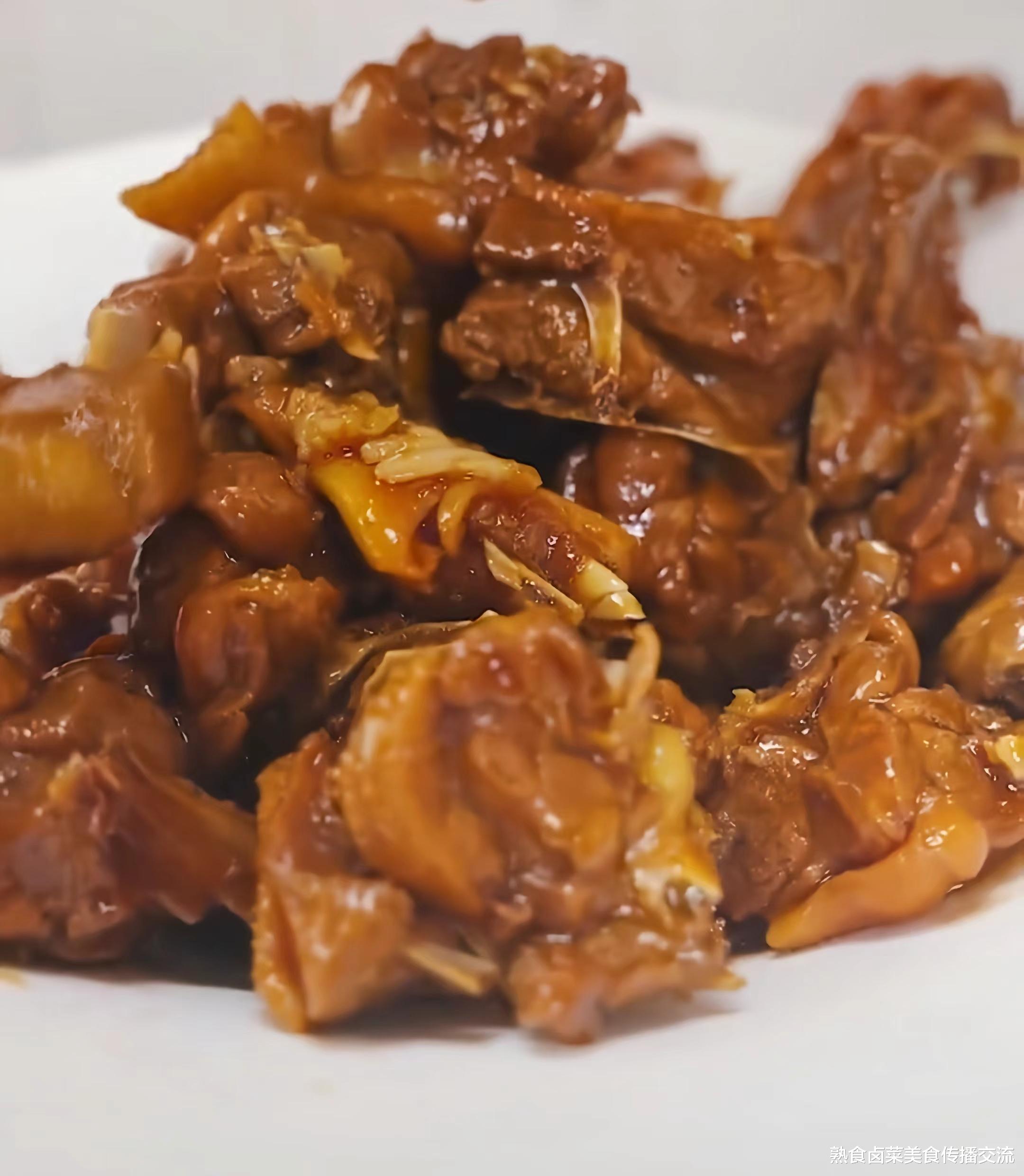 2、炒锅中加入芝麻香油80克、姜片70克,炒出香味后下入鸭肉炒制鸭肉无水分后放入生抽,老抽以及其它剩余配料后,中小火焖煮25分钟后大火收汁即可出锅。
