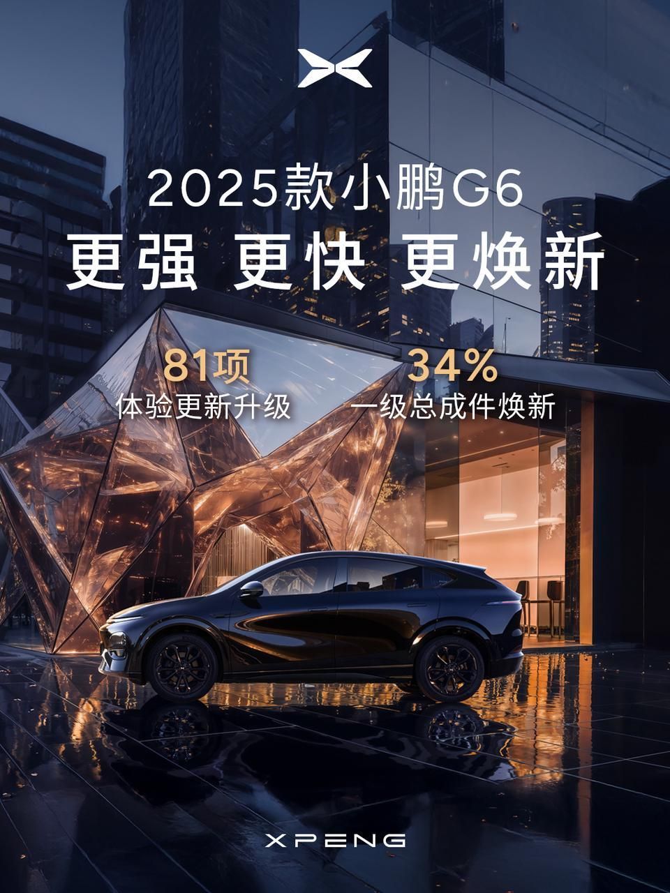 不是一次年度改款,而是越级换代!凭借惊艳外观,舒适配置、智能科技、最大空间等核心产品力,2025款小鹏G6,必然成为开年后掀起行业新风的又一款爆款。2025款小鹏G6展车现已陆续进入全国214城超500店,即日起正式开启品鉴。敬请期待3月上旬的上市,届时将揭晓更多技术亮点!