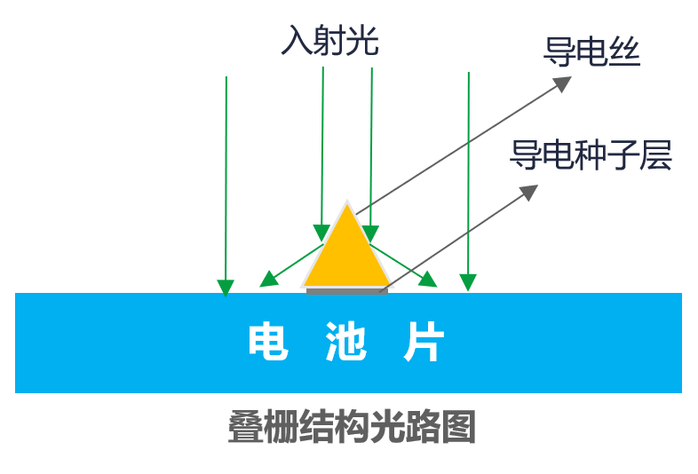 叠栅的核心结构,是在电池表面制备一层用于收集电池片表面电流的导电种子层。在该种子层上方,放置超高表面反射率的极细三角导电丝。导电种子层和导电丝通过导电连接材料,形成导通。
