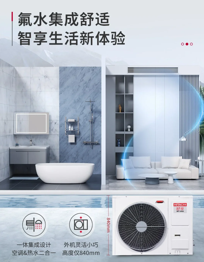 ✅氟水集成舒 适智享生活新体验 *一体集成设计 空调&热水二合一 *外机灵活小巧 高度仅840mm
