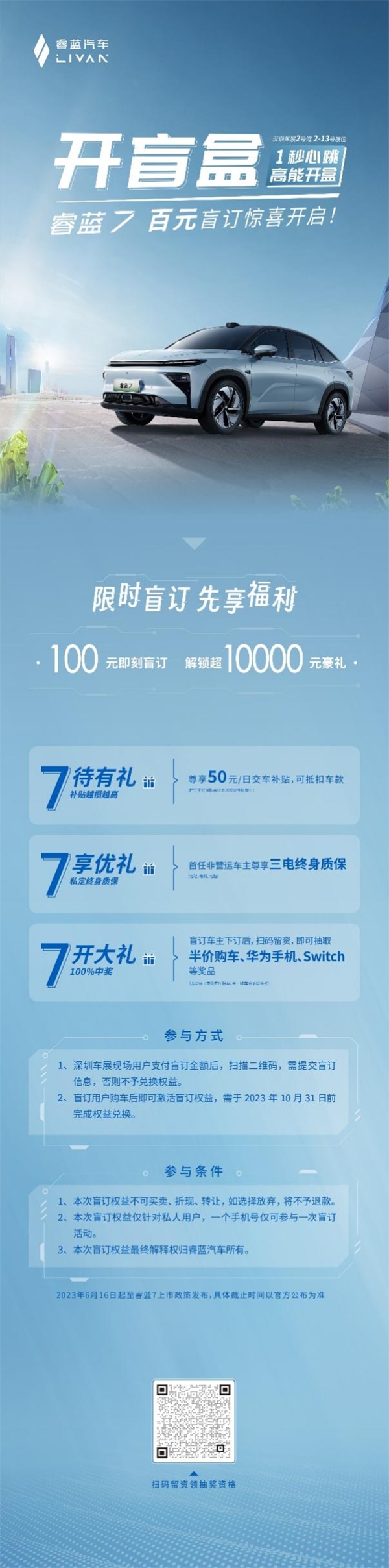 6月16日,睿蓝汽车旗下首款A+级换电SUV睿蓝7正式开启盲订。睿蓝7定位为智能后驱SUV,于今年上海车展正式首发亮相,一经推出,以其酷飒的外观、深度的产品价值获得大量媒体、用户关注。此次盲订活动,睿蓝汽车更是推出三重权益,诚意满满: