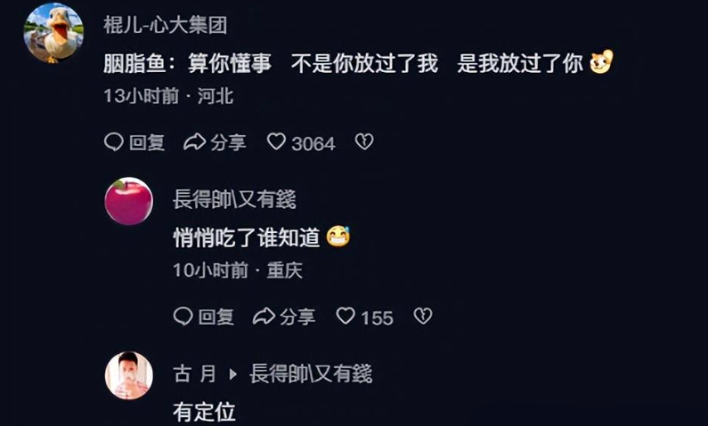 除了视频本身颇具看点之外,评论区的网友也是纷纷金句频出。其中就有一位同样在重庆的网友表示:“博主你可千万别以为是你们放过这条鱼,而是这条鱼放了你们,要是它心情不好一下子嗝屁了,那就你们就插翅难逃喽!”对于此种评论,博主表示自己非常认可,要不然怎么说自己差点竿都没拿稳呢。自己钓鱼这些年来还是懂得一点法律常识的。