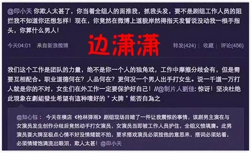 当年,印小天与边潇潇在同剧组拍摄电视剧,突然女演员在公众平台哭诉,印小天欺人太甚,性情暴躁、耍大牌因为不满剧本和自己起来争执,便当着全剧组的人抓她头发、殴打她。一时间,印小天被推上舆论的风口浪尖,虽然印小天在平台上面发誓没有动女演员一根手指头。但女方依然不依不饶:你算什么男人!态度十分强硬。本来到这只是两人之间的一面之词并没有什么证据。结果这时贾乃亮第一个站了出来,喊话印小天,我很生气,前辈,你该反省一下自己!接着黄圣依的老公也晒出了一段模糊不清的截图,笃定的说:两人发生了肢体接触,希望一方向另一方道歉!这言论一出娱乐圈的牛鬼蛇神纷纷开始冒头。