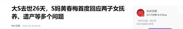 大S去世26天,S妈黄春梅首度回应两子女抚养、遗产等多个问题杭州日报2025-02-28