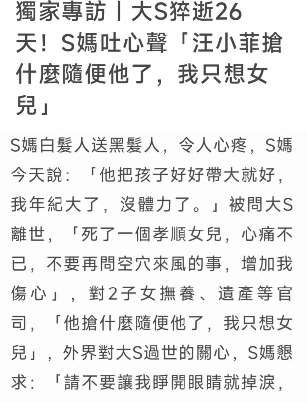 但是现在来说已经不想了,都希望大s早早的入土为安,s家不要因为利益问题让大s的事情再也没有个头了..