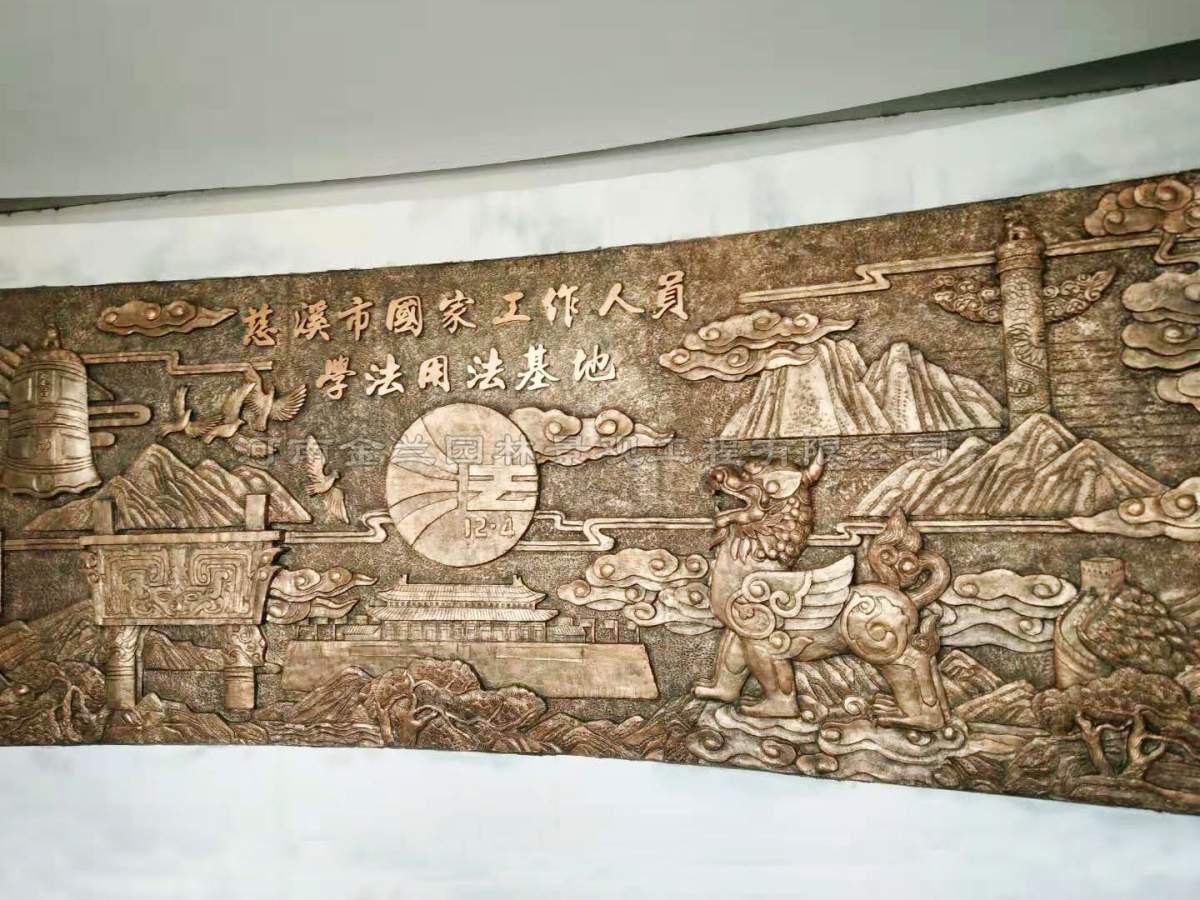 这座浮雕文化墙的建成,不仅是空间美学的提升,更是法治文化传播的创新实践。当参观者步入展厅,首先映入眼帘的是法治历史与现代精神的立体对话:獬豸的威严与和平鸽的轻盈、竹简的厚重与弧线的灵动,共同构建起 “传统为根、现代为魂”的视觉叙事,使抽象的法治理念转化为可感知、可触摸的文化载体。正如金兰园林景观项目负责人所言:“我们始终相信,法治文化建设需要兼顾庄严性与亲和力,通过艺术语言让法治精神‘可见、可感、可传承’。”