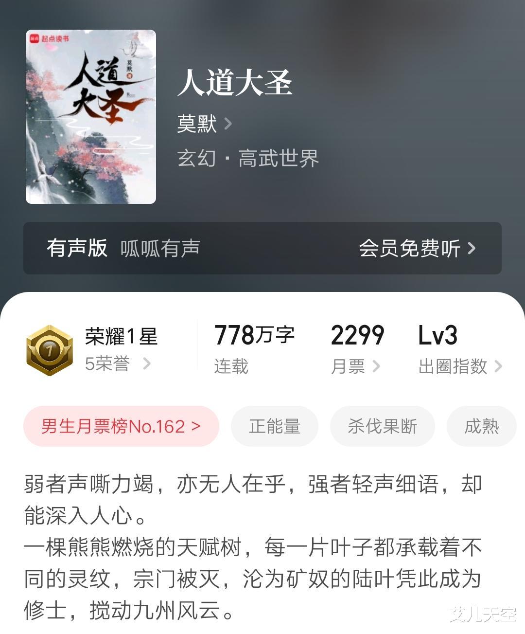 不过不得不说莫默的底子确实很厚,创作也很稳,后面的传统玄幻风格新书《人道大圣》上架时首订虽然不到两千,但一路稳扎稳打,在去年十月上架两年多写到557万字的时候,破了万订。