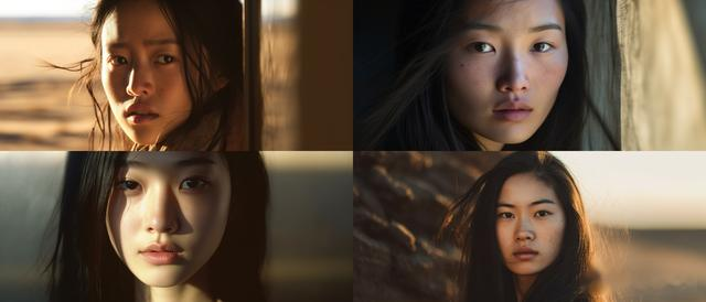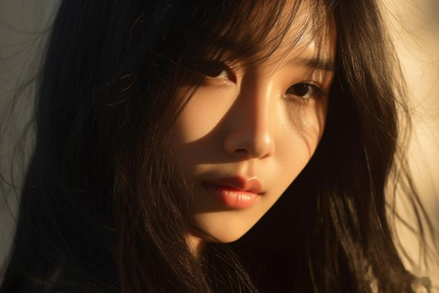 A Chinese young woman with long straight black hair and black eyes has a pretty sun shining through in the background, light brown and dark brown, close - up intensity, shadow play, photo taken with provia --ar 3:2 --style raw --v 5.1