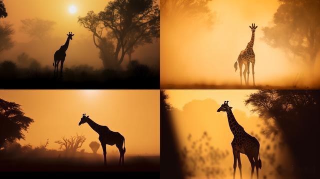 dark silhouette of an ethereal shadow of a Giraffa | appearing in the mist | chiaroscuro | dark golden palette | 8K; darkness; shadow silhouette --style raw --ar 16:9 --v 5.1