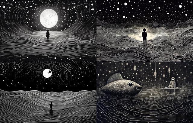 person in the sea, drawing, in the style of whimsical yet eerie animal symbolism, light silver and black, mysterious space, solarpunk, storybook illustration, traditional animation, hurufiyya --ar 30:19 --v 5.1