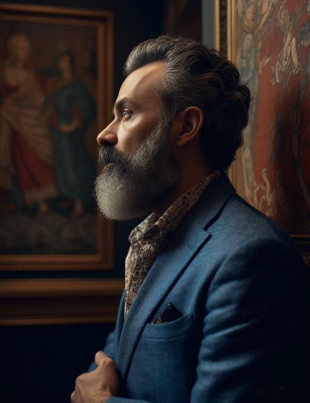 Editorial style side-view medium-full photo shot on Fujifilm Pro 400H of a 40-year-old greek man with short gray hair & full beard pondering a masterpiece in a Musée d'Orsay Gallery. He's wearing a blue jacquard blazer by Ferragamo with a white button-up. The soft gallery lighting and careful composition evoke a sense of refined luxury and creative curiosity as he gazes fixedly at the magnificent painting in front of him --ar 17:22