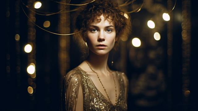 Danae by Gustav Klimt photographed by Peter Lindbergh, wearing lace open at the top, moon night, gold filigree, texture detailed, minimalist, Lomography Color Negative 800 ISO 35mm analogue photo, grainy photo 24mm lens, fashion, bright, pastel colors --ar 16:9 --s 750 --v 5