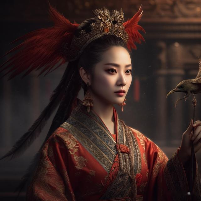 imagine a beautiful and intelligent image of Wang Xifeng from Dream of the Red Chamber wearing a phoenix crown and holding a whip