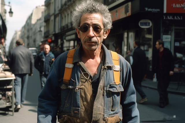1990s medium-full street style fashion photo shot on Kodak 500T capturing a rugged 50-year-old man with curly gray hair, 5-o'clock shadow, and a stern look walking down the sidewalk on a bright spring morning in Paris. He's wearing worn-down Carhart apparel with a leather carpentry tool belt. Careful composition and morning mist. --ar 3:2