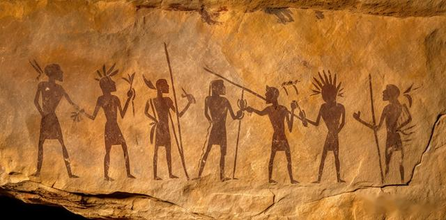 some rock art depicts a group of warrior statues, in the style of experimental calligraphy, bill traylor, albert bierstadt, trompe-l'œil illusionistic detail, structural symmetry, yigal ozeri, small brushstrokes --ar 161:80 --v 5.1