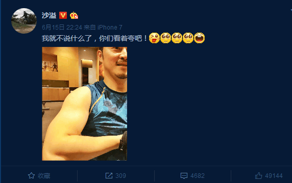日子过的越来越幸福,这幸福的标志就是沙溢越来越胖了,最近在做锻炼的沙溢,在微博晒出肌肉照片,还配文:我就不说什么了,你们看着夸啊!这求表扬的目的这么明显,真的好吗?