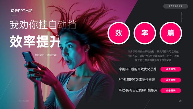 这份文档是幻云PPT作者(我本人)原创的,根据个人8年PPT从业经历,结合大多数职场人制作PPT的痛点,打造的可以帮你高效提升ppt制作效率的速查手册,涵盖了审美提高,字体使用,ppt放映,ppt图片素材,创意图片排版技巧,ppt数据美化思路,ppt配色技巧和案例,以及ppt效率插件推荐,正确的ppt美化思路等等。
