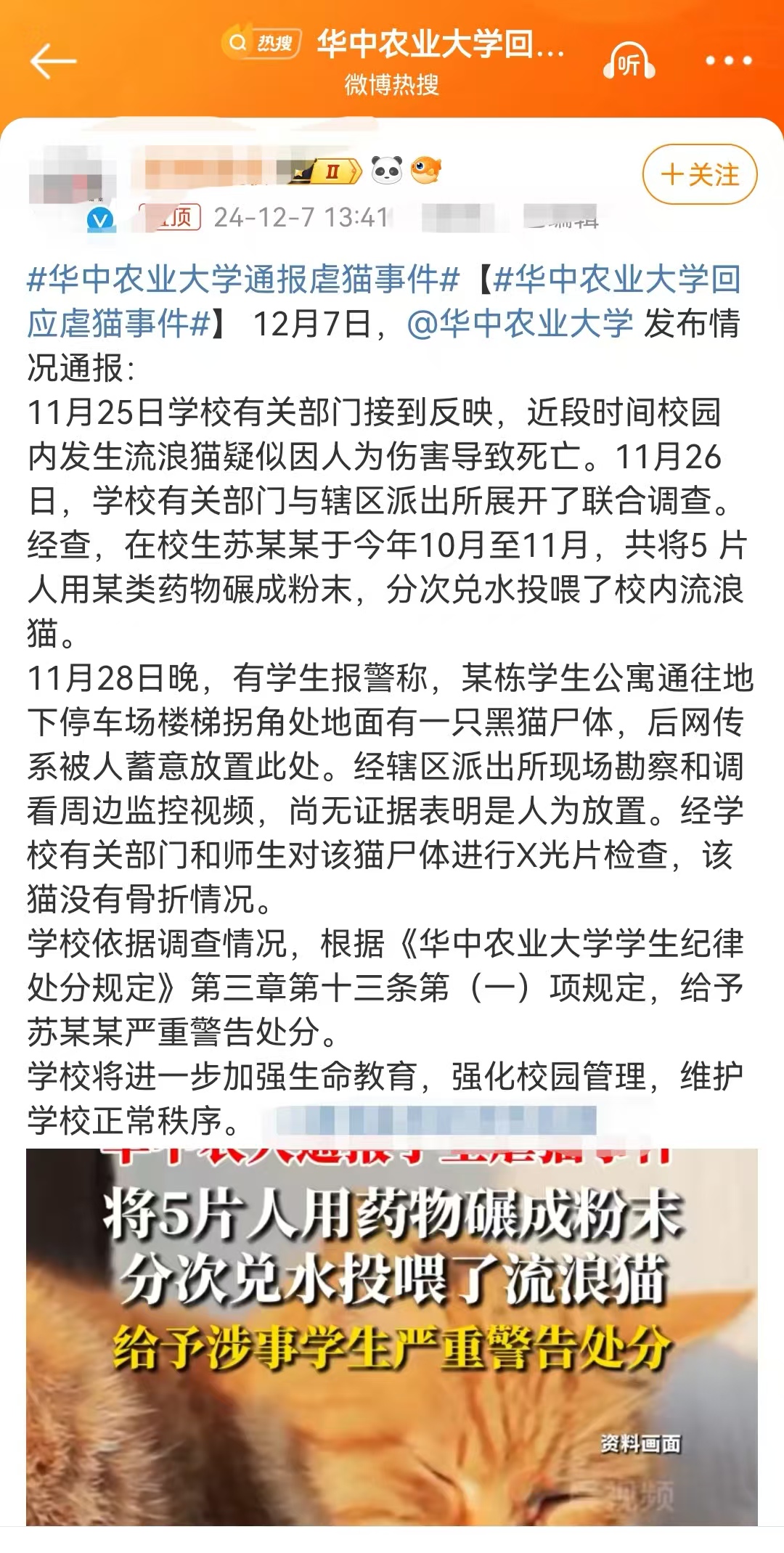 近日,华中农业大学的虐猫事件引发了广泛的关注和讨论。一名学生将5片人用药物碾成粉末,分次兑水投喂了校园内的流浪猫,最终导致流浪猫死亡,该学生也因此受到了学校的严重警告处分。这一事件不禁让我们深思:在对待动物的问题上,我们应该持有怎样的态度?