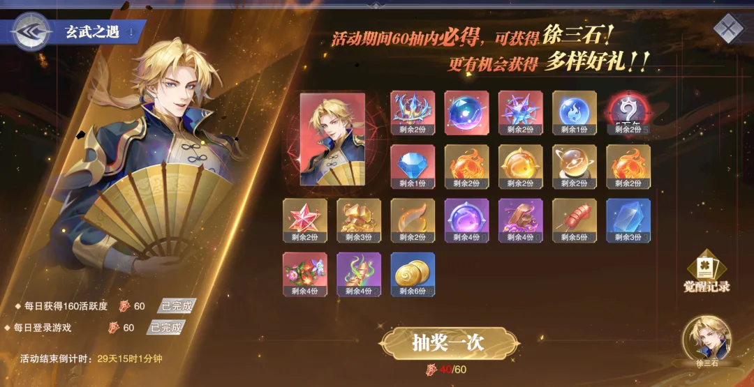 接着官方又上了一个玄武之遇的活动,这个活动每天自然可以拿2抽,而所有标注的奖励加在一起一共有60个,算下来倒是刚好可以拿完,且购买一些礼包还能多拿到XX次的抽取机会,不过这个活动的标题写的事“活动期间60抽内必得”???必得啥啥东西它也没有明确标注,而后边跟着一句可获得徐三石......就把我搞的有点懵了,到底是60抽内必得啥?又是不是必得徐三石的意思呢?