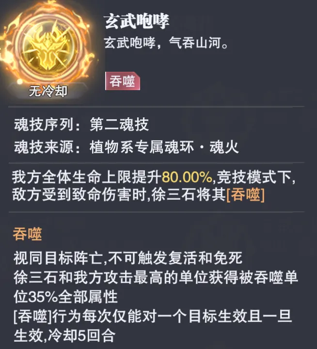 “吞噬”时几乎没有任何的特效,同时在徐三石的头像上也没有任何的图标提示,所以例如战斗中什么时候吞噬的,吞噬cd还有几回合,到底吞噬的对象是谁都很难察觉,不少时间还会给我们一种是不是根本就没有吞噬的错觉