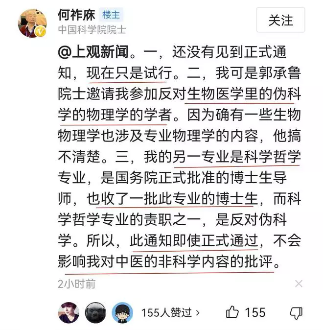 即使中科院的新规定正式通过,也不影响他对“中医药非科学内容”的批评。