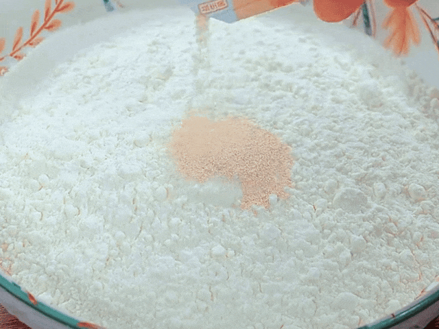 盆里+500克面粉和3克酵母、以及330毫升温水,先搅成面絮后,再揉成光滑的面团不用发面先放一边(咱们的面团是半发面,面粉里+少量的酵母会更加的柔软,而且还不容易发硬,老人孩子都比较适合)。